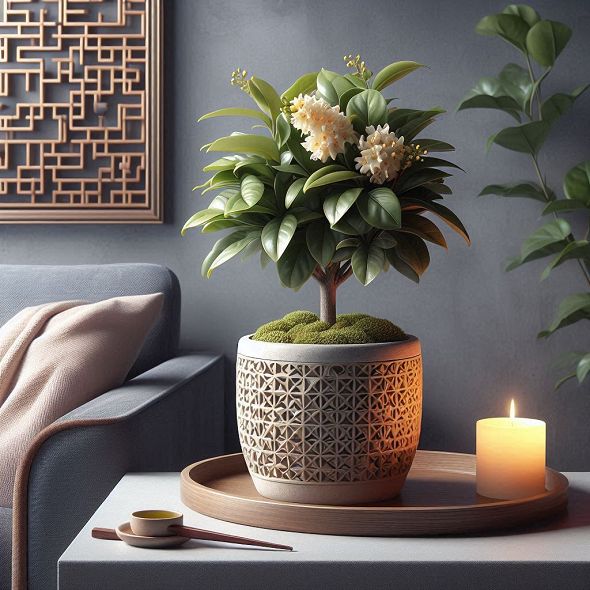 3,桂花,桂花花朵小巧、香氣濃郁,是東方庭園中象徵團圓與秋意的代表。品種分為金桂、銀桂與丹桂,喜陽光與通風環境,秋季開花,可製桂花糕、泡茶、釀酒,是文化與香氛兼具的植物。